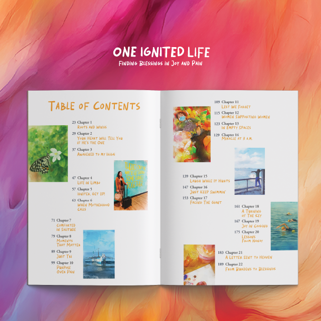 “One Ignited Life is a heartfelt collection of stories that reminds us how even our hardest seasons can spark growth, gratitude, and grace. Through her honest and faith-filled reflections, JV Wong weaves lessons from her own journey, from love and loss to finding her ikigai, gently inviting us to pause and see the blessings in our own lives. It’s an inspiring, beautifully written read that feels like a deep conversation with a wise dear friend over coffee. A wonderful debut from someone who truly lives what she writes.”